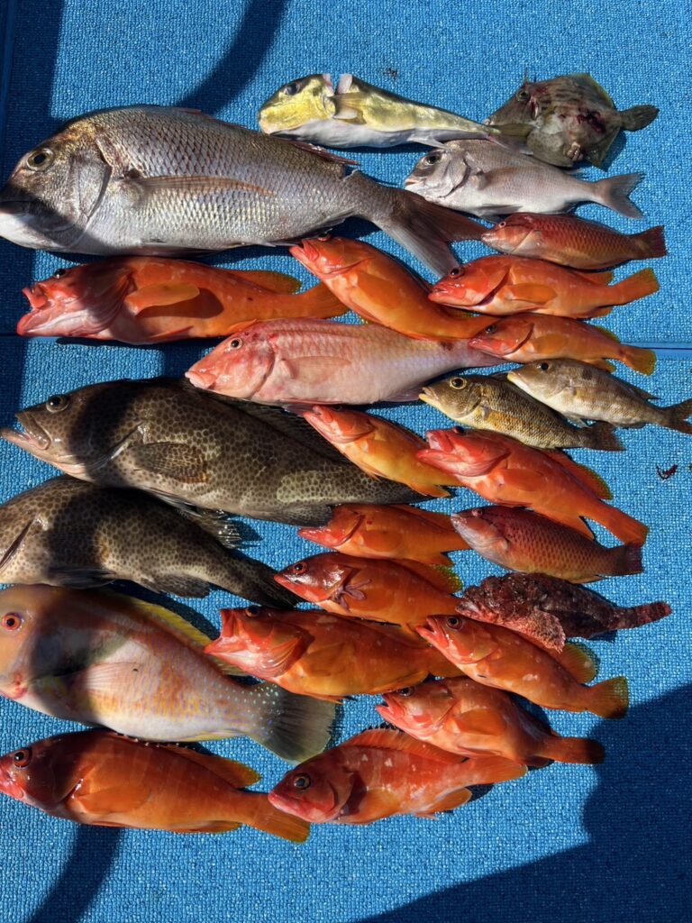 本日3名でひとつテンヤでアカハタ釣りでした。初めての女の子も沢山釣ってくれました。40のアカハタやゲストにホウセキハタ、尺ガシラ、赤やがら、カワハギ、おじさん、など五目釣りでした。