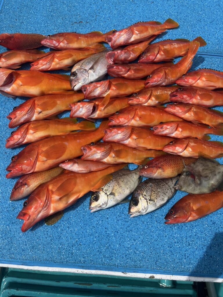 本日3名でひとつテンヤでアカハタ釣りでした。アカハタ大漁でした!ゲストにメイチ鯛やおじさんなども釣れました。小さなアカハタ大量リリース感謝です。