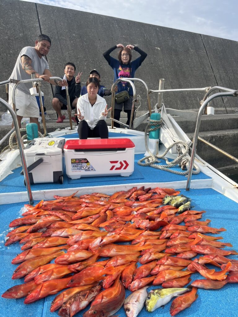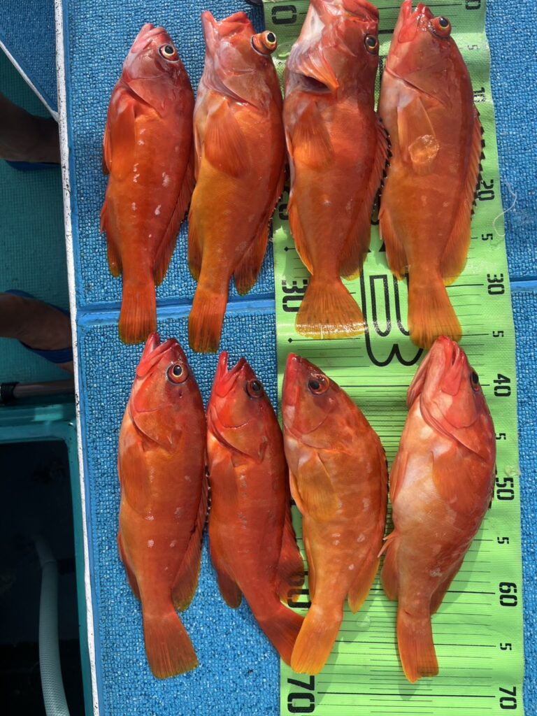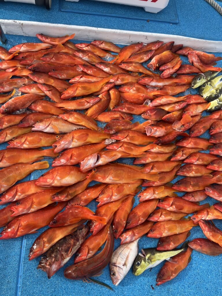本日3名、全員初めてのひとつテンヤでファミリーフィッシングでした。良型のアカハタ、ホウセキハタ、がしら、メイチ鯛、おじさんなど五目釣り出来ました。