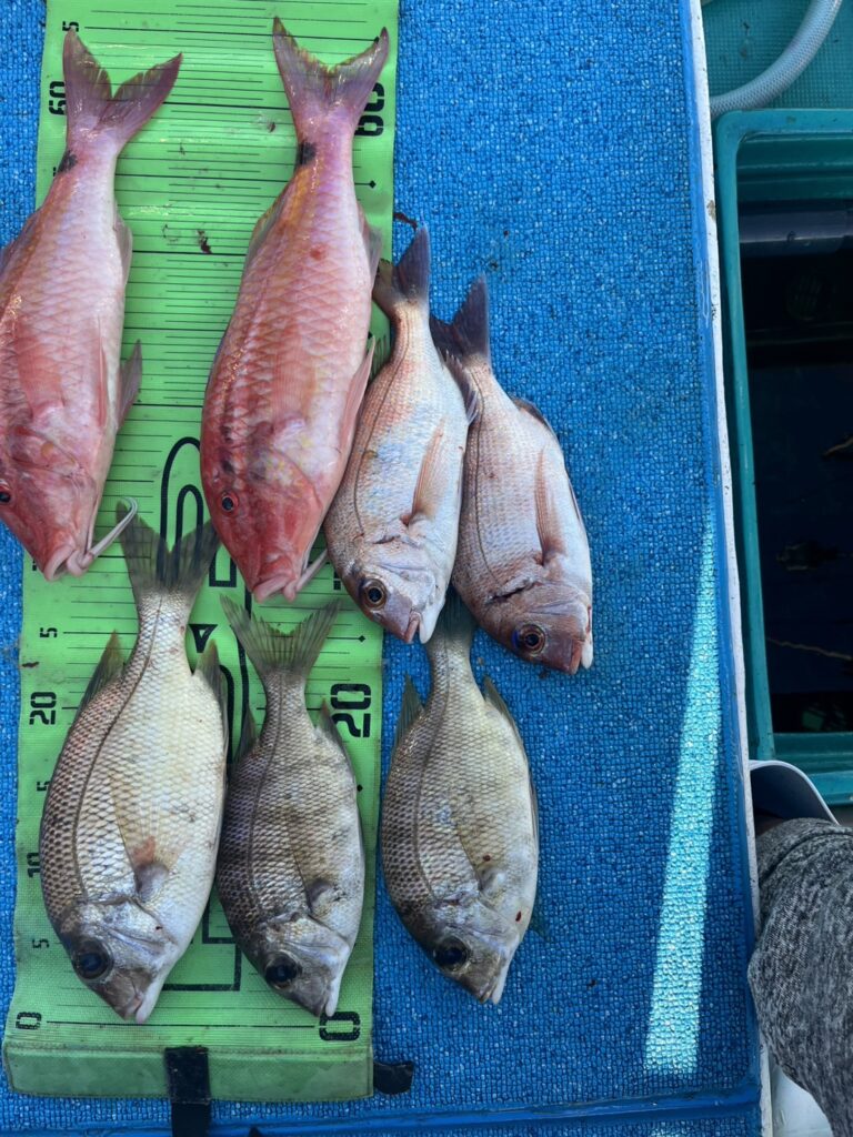 3名でファミリーフィッシングでした。船は流れにくかったですが、海老のひとつテンヤで色々釣れました。良型のタマン、コロ鯛、メイチ鯛など五目釣りでした。