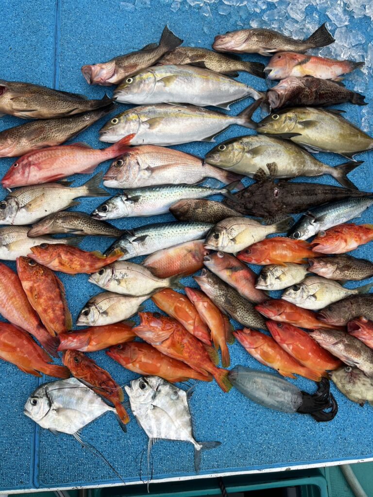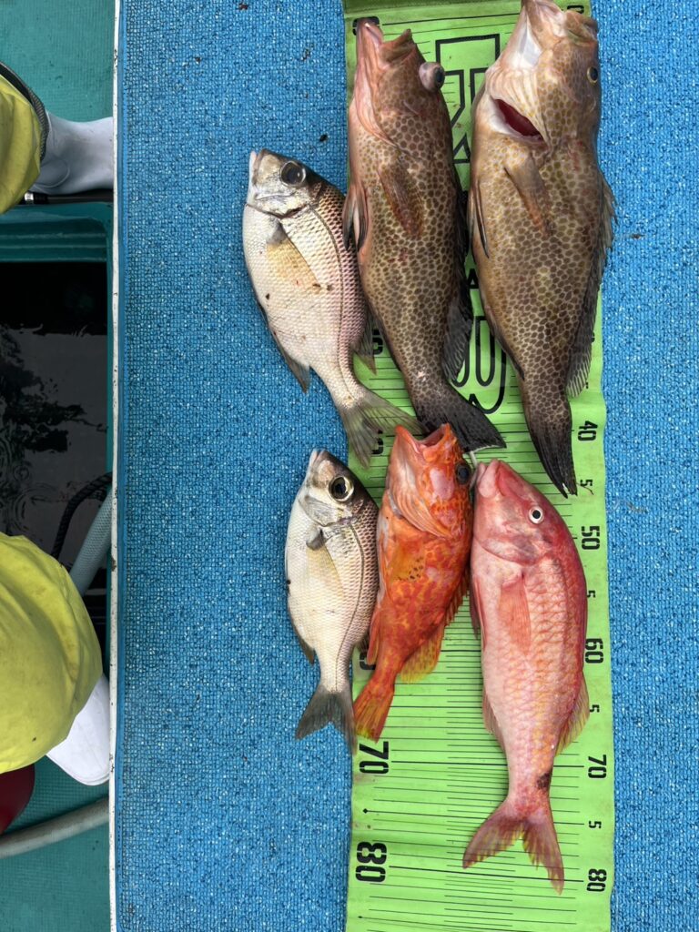 アカハタ、メイチ鯛、おじさん、サバなど五目釣りでした。