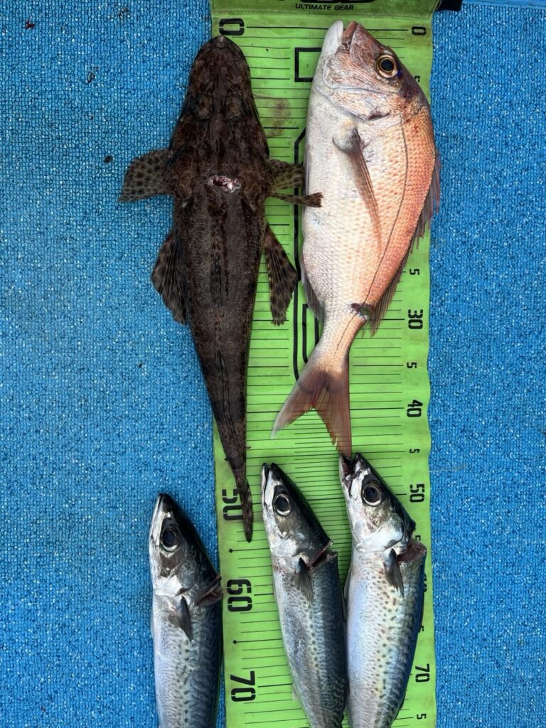本日5名でチャーターでした。SLJ.タイラバでした。強風で状況悪い中、上手く五目釣りしてくれました。お客様、本日泊まりで食べれる分だけ釣って早上がりでした。