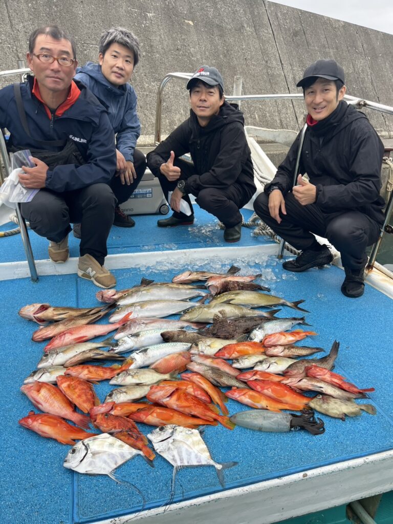 本日は5名でSLJ.タイラバでした。朝から風無し潮無しからの爆風で状況の悪いなか頑張って五目釣りできました。オオモンハタ、アカハタ、さば、真鯛、メイチ鯛、車鯛、おじさん、カイワリ、糸ひきアジ、イサギ、がんぞうヒラメ、カワハギ、サバフグ、イラ...