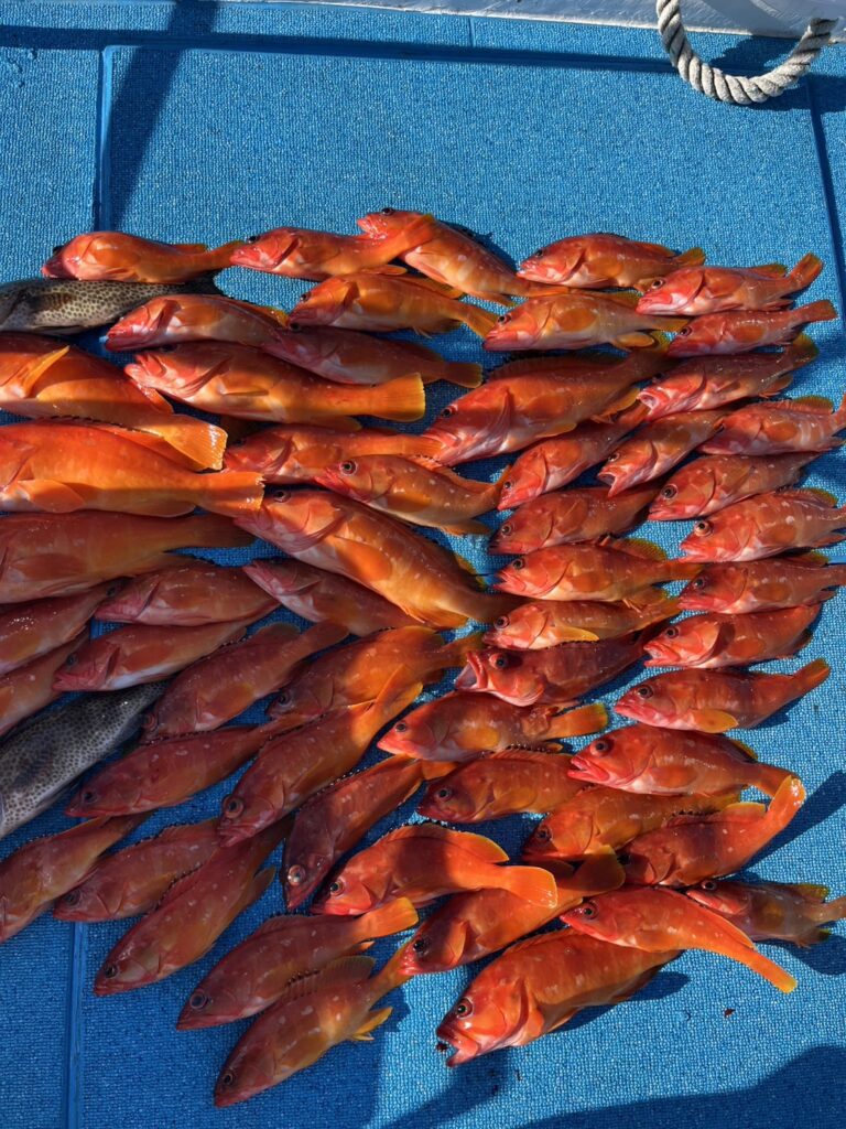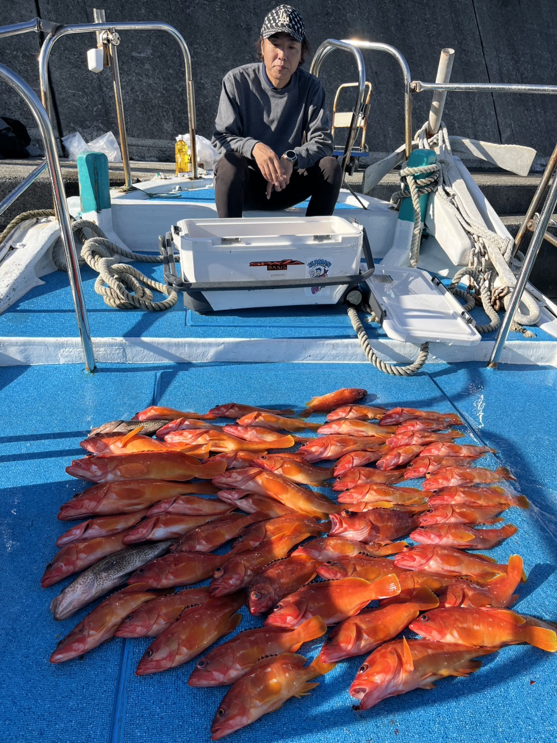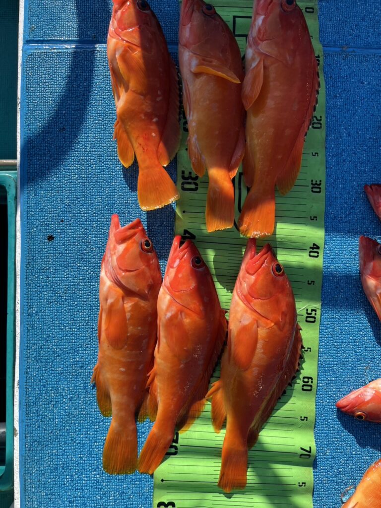 本日3名でひとつテンヤでした。アカハタ大漁でした。飲食店のお客様なので、あがった魚以外は活かして持って帰りましたが、メイチ鯛などあがりが多かったみたいです。
