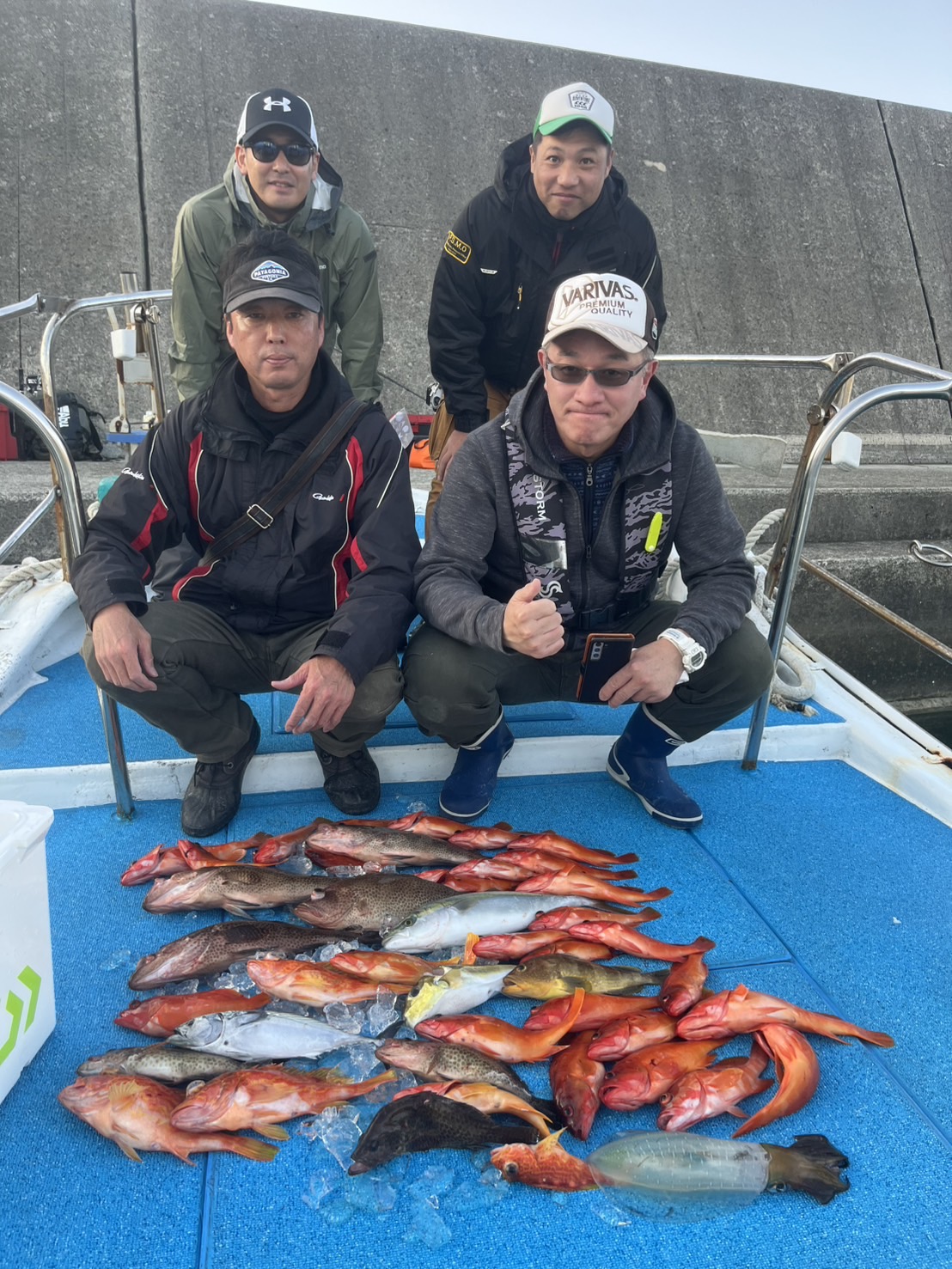 本日4名とお子様一人でチャーターでした。強風の中タイラバ、一つテンヤで、色々美味しい魚が釣れました。小さなアカハタ大量リリース感謝。