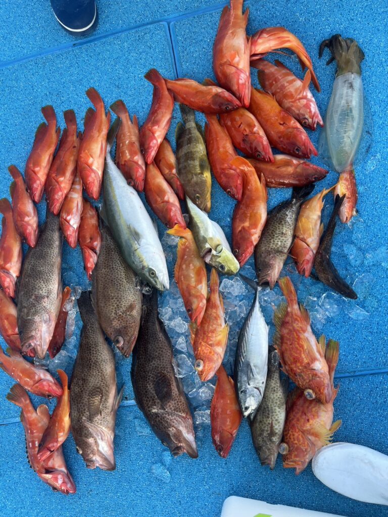 今日は3名でSLJ、ジギングで五目釣りでした。オオモンハタ、赤ハタ、青ハタ、ホウキハタ、カンパチ、メイチ鯛、グレ、真鯛、サゴシ、マトウダイ、あやめカサゴ、ごま鯖、アジ小さなハタ、リリース感謝です!