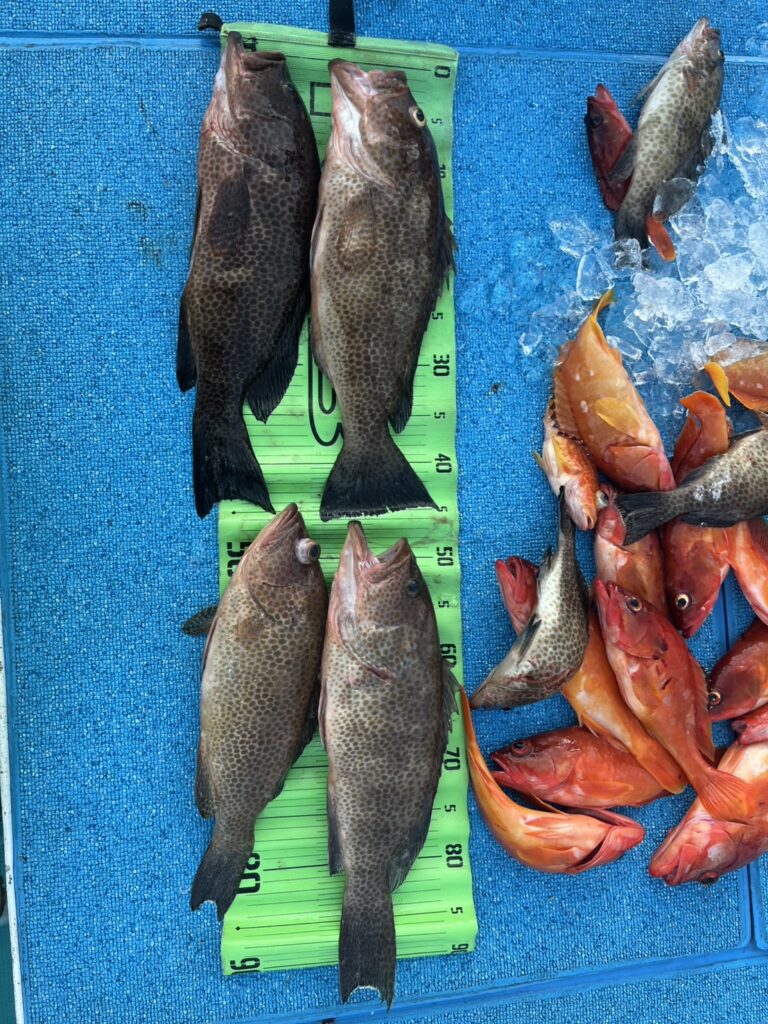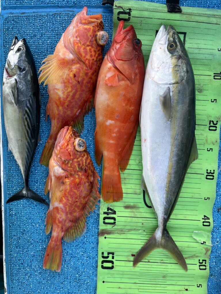 本日3名でチャーターでしたが、船酔いで1人ダウンでした。親子でタイラバ、50オオモンハタ、真鯛、アカハタ、アカヤガラ、あやめカサゴなど五目釣りでした。