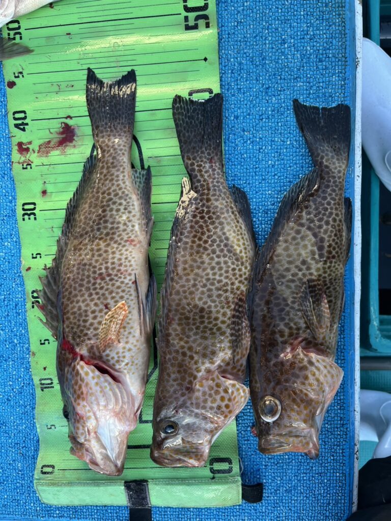 本日3名でSLJでした。良型のオオモンハタ、アカハタにゲストでヒラメ、あこう、クロホシフエタイなど五目釣り出来ました。