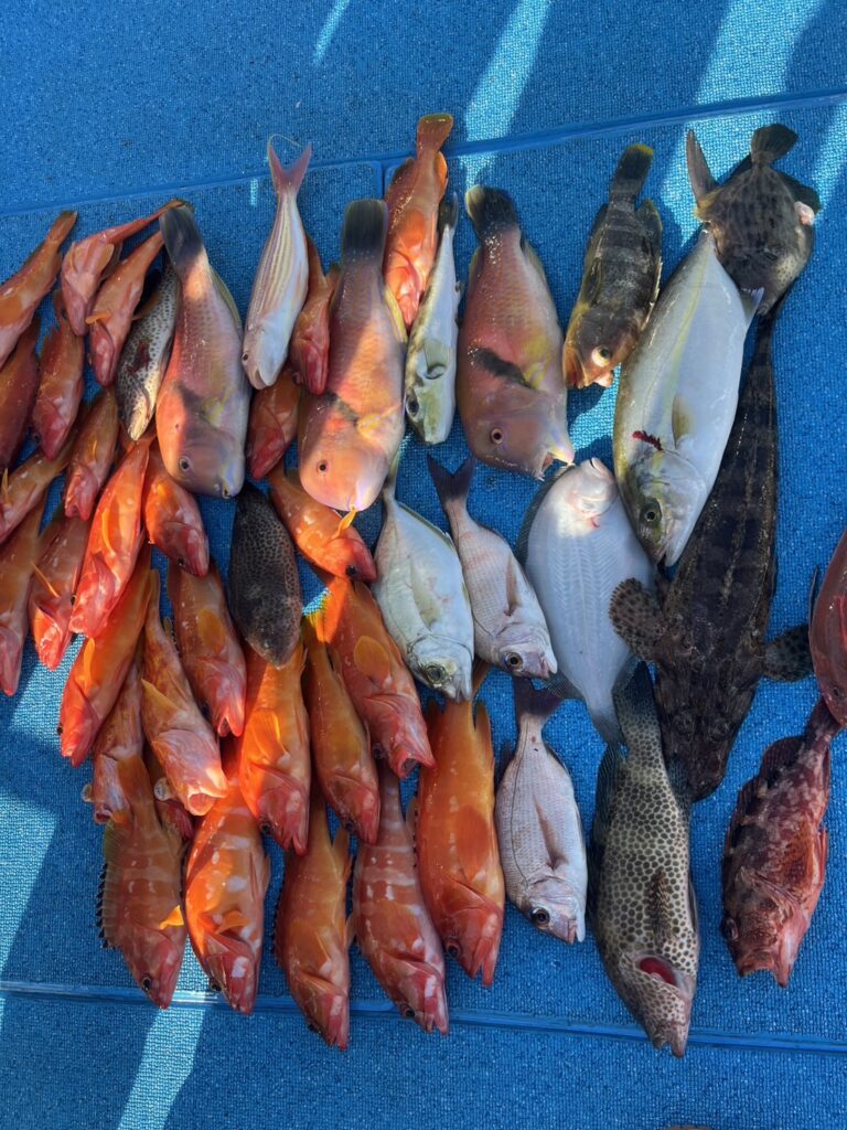 本日は大人2名と子供2名のファミリーフィッシングでした。船が流れくい中、小学生の船釣り初心者の子供がよく釣ってくれました。ティップランも少しして、見事ゲット。良型のアカハタや美味しいメイチ鯛など五目釣りでした。