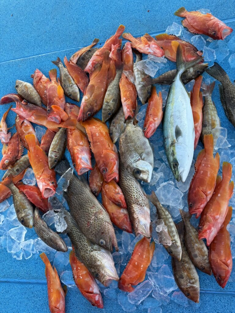 本日3名でチャーターで一つテンヤでアカハタ釣りでした。良型のアカハタが大漁でした。ゲストにカンモンハタやオオモンハタ、メイチ鯛、ガシラ、おじさんなど色々と釣れました。アカハタ大量リリース感謝です。