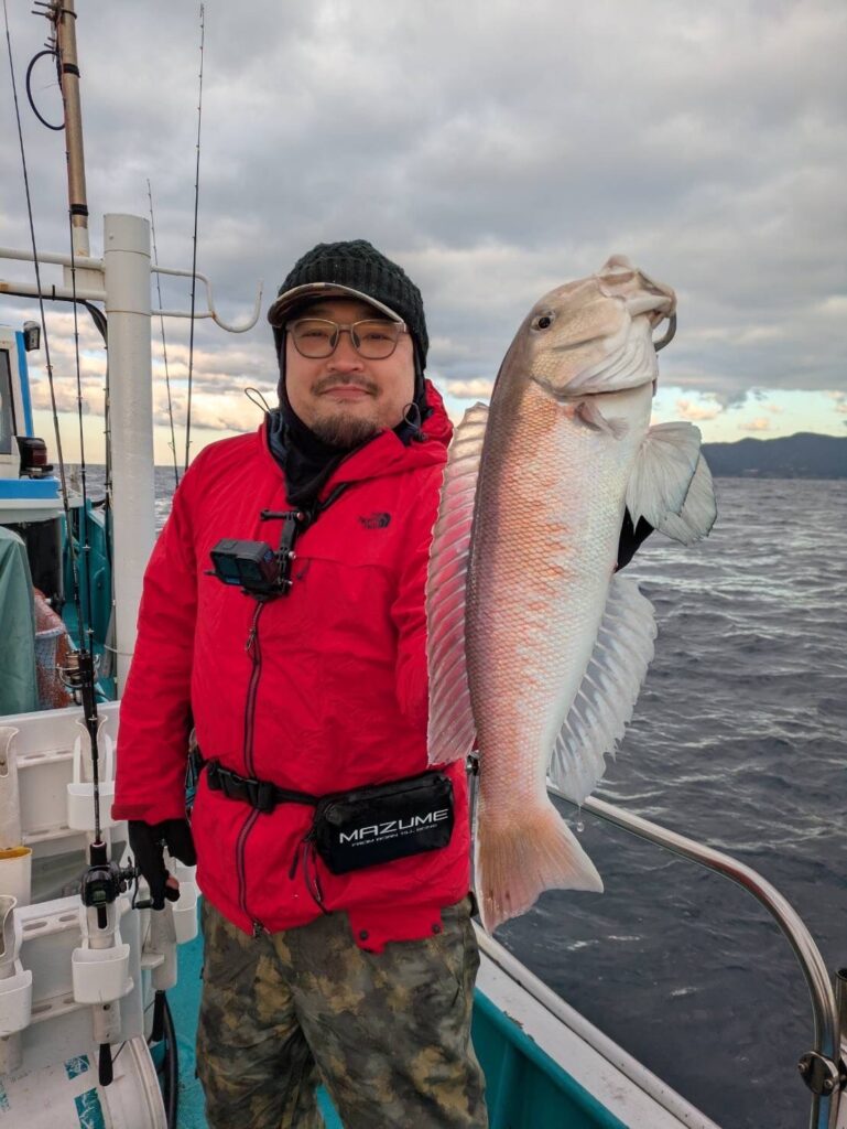 5名でタイラバ、SLJでした、爆風で最悪状況の中、頑張って釣ってくれました。50のオオモンハタや美味しい、メイチ鯛もつれてよかったです。ハタ大漁でした!小さなハタ大量リリース感謝。