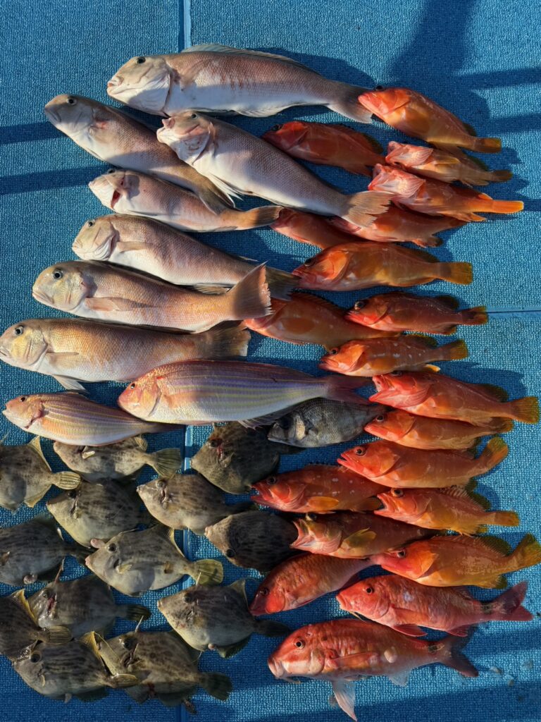 本日4名で甘ラバ、SLJ、一つテンヤでした。良型のオオモンハタ、白甘鯛、アカハタは無限なのでやめました。メイチ鯛や青ハタなど五目釣りでした。アカハタ良型もリリース感謝。