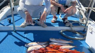 釣果情報9月10日 ひとつテンヤ.甘ラバ 本日2名でチャーターで一つテンヤ、甘ラバでした。アカハタは良型が大漁でした。二人とも初甘鯛でしたが、見事に良型を1匹ずつゲットでした。尺ガシラ、メイチ鯛も釣れて美味しい魚の五目釣りでした。 2025月09年25日釣果情報